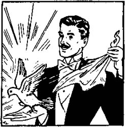 In diesem ausgezeichneten Manuskript werden nicht weniger als 16 (!) verschiedene Vorrichtungen zur Produktion einer lebenden Taube vom Körper ausführlich erklärt. 30 Abbildungen erläutern den Text. 4 der beschriebenen Hilfsmittel sind unsichtbar, d. h. die Taube braucht nicht aus der Haltevorrichtung zu schlüpfen, sondern sie ist sofort nach der Produktion frei! Jeder Taubenmagier muß dieses einmalige Manuskript lesen.