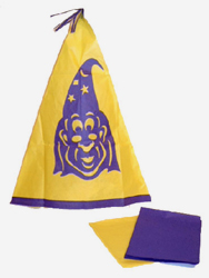 Sie zeigen 2 Bögen verschiedenfarbiges Seidenpapier vor. Diese werden wiederholt der Länge nach durchgerissen, zusammengelegt und schließlich zu einem Päckchen gefaltet. Wenn Sie dieses Päckchen wieder auseinander falten, ist aus den Fetzen ein schöner, zweifarbiger Zaubererhut geworden, den Sie einem Kind aufsetzen können: Mit dem Antlitz eines Magiers darauf und Fransen an der Hutspitze!