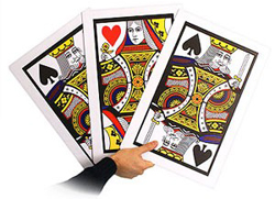 Sie stehen zwischen zwei Stühlen und zeigen drei Super-Riesenkarten deutlich einzeln vor: Es handelt sich um zwei Kreuz Könige und eine Herz Dame. Zwei Karten stellen Sie mit den Rückseiten zum Publikum auf die Stühle, eine halten Sie in Ihrer Hand. Die Karten werden ganz langsam und sichtbar vertauscht. Und nun sollen die Zuschauer sagen, wo die Dame ist. Die Zuschauer können noch so gut aufpassen, sie raten falsch. Die erste Karte, die sie nennen, ist ein König. Sie dürfen noch eine zweite Karte bezeichnen, aber auch das ist ein König. Sie drehen die dritte Karte um: Es ist die Dame!