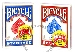 Ein komplettes Bicycle Spiel als “kurzes Spiel”: Ausgangsformat ist das Pokerformat, die Breite ist auch so geblieben, aber das gesamte Spiel, also alle 52 Karten plus 2 Joker, sind in der Länge 1,6 mm kürzer. Diese Kürzung ist professionell, d. h. die Karten haben dennoch vollständige „runde Ecken“. Es handelt sich also nicht um ein Spiel im regulären Format, dass „nachträglich abgehackt“ wurde, sondern um ein von vornherein fabrikmäßig einwandfrei hergestelltes kurzes Spiel – direkt aus der Fertigung der US Playing Card Company!