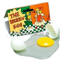 Ein Spiegelei, dessen Eiweiß (Fläche ca. 14 x 14 cm) noch klar ist, da es nicht gebraten wurde, dazu 2 Eierschalen, deren „zackiger“ Rand auf eine zerbrochenes Ei weisen. Zu verwenden als Produktionsgegenstand oder als gag im Lauf einer Routine mit einem oder mehreren echten bzw. künstlichen Eiern.