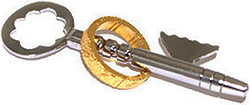 Sie borgen den Ring eines Zuschauers und zeigen, dass es unmöglich ist, ihn über Griff oder Bart eines großen Schlüssels auf den Schaft zu fädeln. Sie übergeben dem Zuschauer beides mit der Aufforderung, es selbst zu versuchen, was missling…Nun bringen Sie selbst Ring und Schlüssel kurz hinter Ihren Rücken und wieder nach vorne: Jetzt sitzt der Zuschauerring auf dem Schaft Ihres Schlüssels! Der Zuschauer wird ihn nicht herunter bekommen… Sie schon, wenn Sie beides erneut kurz hinter den Rücken führen und anschließend getrennt wieder zum Untersuchen reichen!