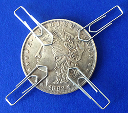 Eine Münze, in welche ein starker Magnet eingebaut würde. So können Sie die Münze an eisenhaltige Flächen bzw. Gegenstände "heften", um sie von dort für eine Produktion heimlich abzugreifen, oder um sie dort im Rahmen eines Münzenverschwinden heimlich abzulegen. Ebenso können eisenhaltige Gegenstände an der Münze „angeheftet“ werden. Lieferung ohne Routine.