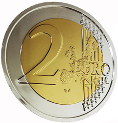 2 Euro Riesenmünze wie sie schöner nicht hätte gelingen können: Schwere Ausführung aus massivem Metall, 7 cm Durchmesser, 3 mm stark, Gewicht 86 Gramm. Sauber geprägt und eurotypisch zweifarbig, d.h. innen goldfarben, Randbereich silber. Einwandfreies, glänzendes Oberflächenfinish.