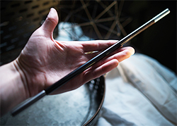 Schicker geht’s nicht mehr! Zauberstab aus poliertem und gewachstem Ebenholz mit silberfarbenen Metallenden, welche etwas abgerundet sind. Schlanke Form, Durchmesser 0,95 cm, Länge 34,3 cm. Geliefert in einem Veloursbeutel mit Schnürzug sowie einem Poliertuch! Das Gewicht von 75 Gramm ist optimal für diverse Wand Spins oder Striking Vanishs wie z. B. im Rahmen des Becherspiels.