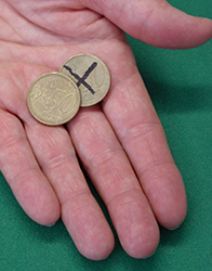 Sie zeigen den Zuschauern zwei gleiche 50 Cent Stücke von vorne und von hinten. Die Münzen sind absolut identisch, auch das Prägeland, erkennbar an der Rückseite, ist gleich. Der Zuschauer darf eine Münze auswählen und mit einem Filsstift markieren. Sie drehen sich um. Der Zuschauer gibt Ihnen hinter dem Rücken eine Münze in die Hand. Er selbst behält die andere Münze und hält die Hand ebenfalls hinter dem Rücken. Erst jetzt drehen Sie sich wieder zum Publikum. Sie haben scheinbar absolut keine Möglichkeit, herauszufinden, wer welche Münze hat, beide Hände befinden sich hinter dem Rücken! Trotzdem können Sie 100 % treffsicher und ohne Fehler immer die Münze benennen, die der Zuschauer in der Hand versteckt hält.